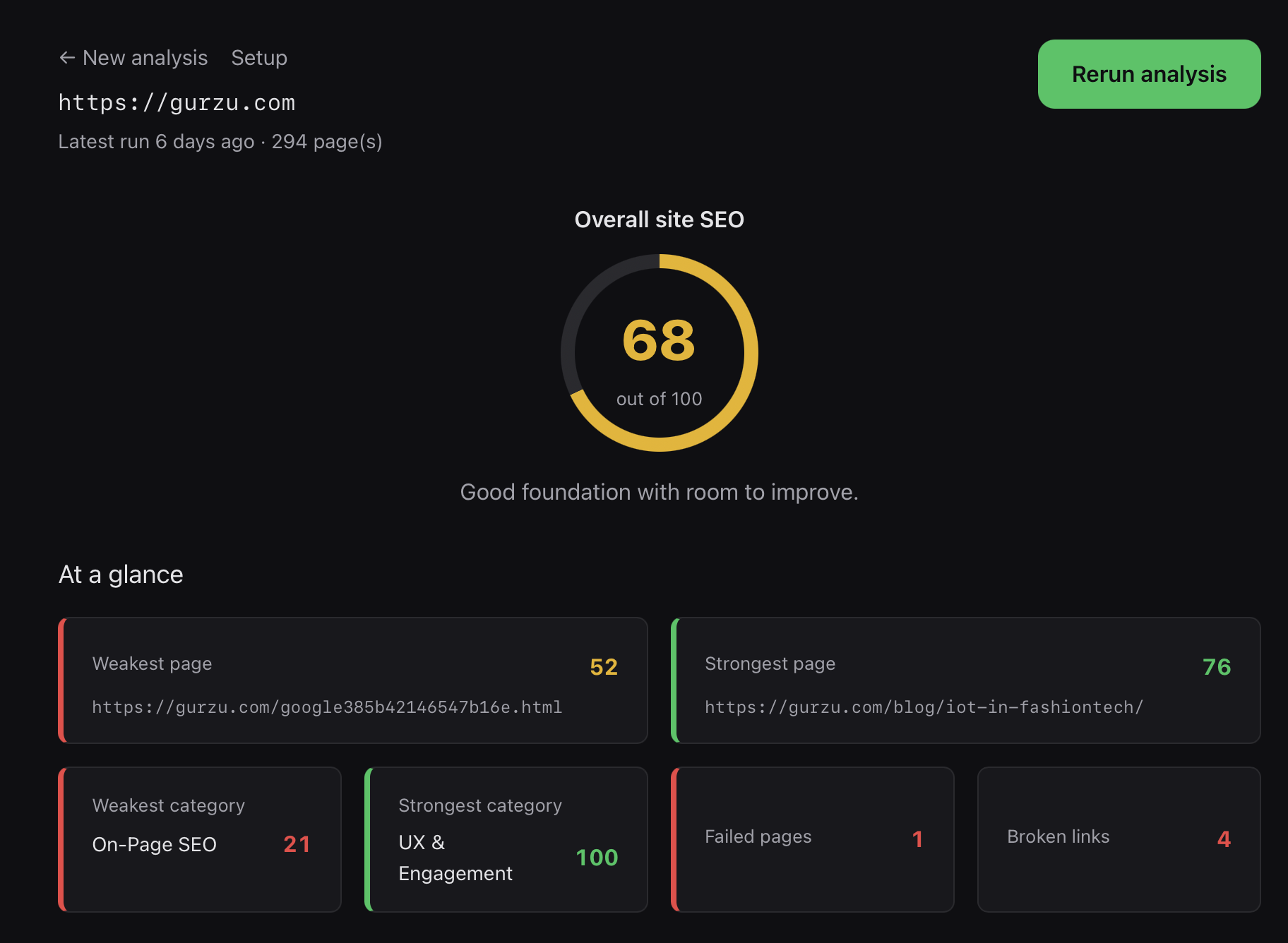Get a free SEO audit in seconds. Enter your website or sitemap URL — we check 13 categories (technical, on-page, Core Web Vitals, mobile, links). First 10 URLs free. No sign-up required.